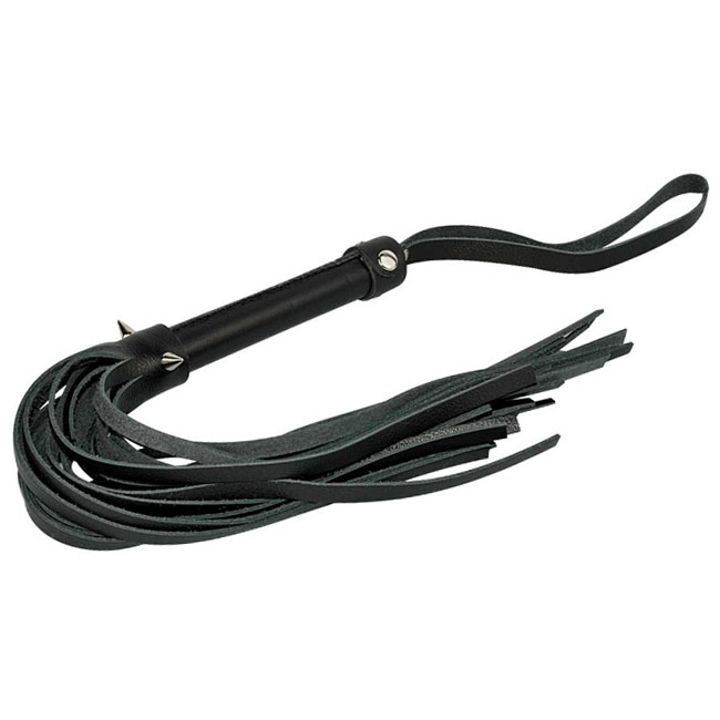 Небольшая чёрная плеть из натуральной кожи с декором в виде трех металлических шипов на рукояти. Стильный и удобный БДСМ-аксессуар для "хорошей" порки и эротических интимных игр.